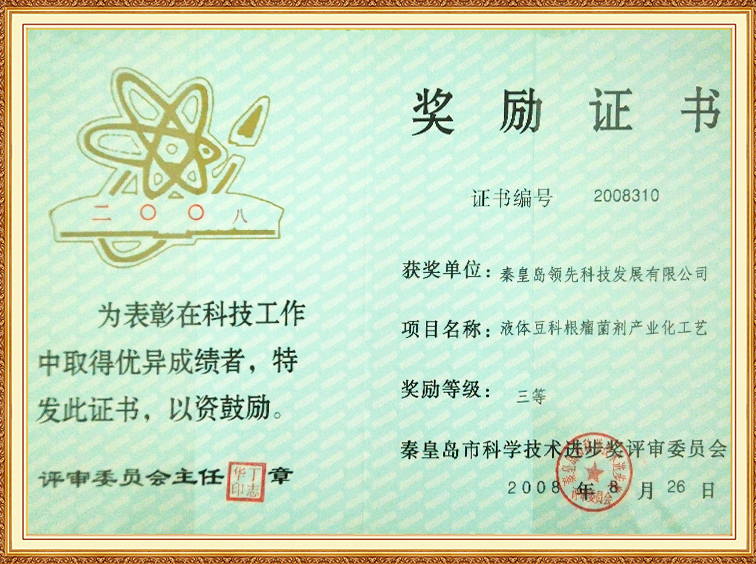 液體豆科根瘤菌劑產(chǎn)業(yè)化工藝—秦皇島市科學(xué)技術(shù)進(jìn)步三等獎